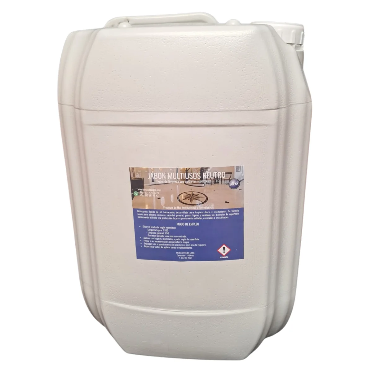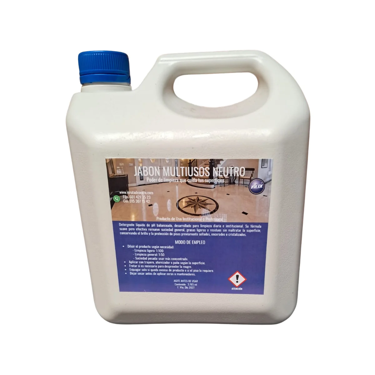 El Jabón Multiusos Neutro es un limpiador líquido concentrado, biodegradable y de pH neutro, diseñado para la limpieza diaria y mantenimiento profesional de pisos y superficies lavables.